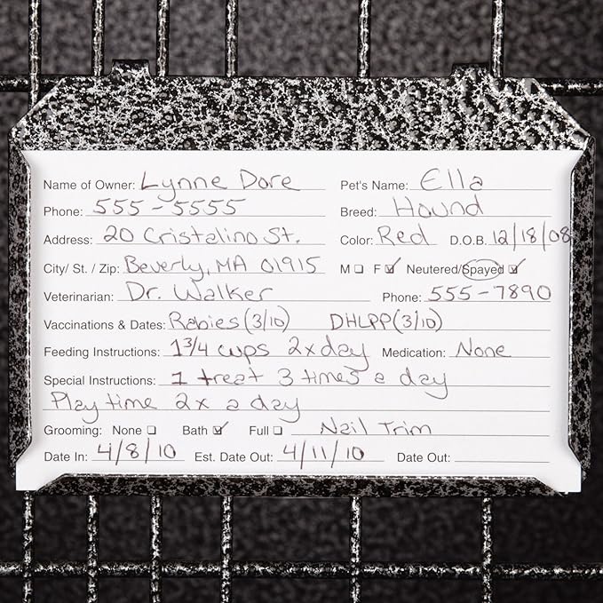 - Each includes a slide-out plastic floor tray, a removable floor grate, a secure latching door, and a FREE 3" x 5" kennel card holder