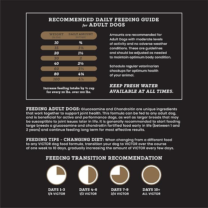 - HIP & JOINT HEALTH: VICTOR Performance dog food is designed with added glucosamine and chondroitin to support hip and joint health in active adult dogs
