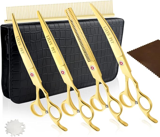 LILYS PET Professional PET DOG Grooming Coated Titanium scissors suit Cutting&Curved&Thinning shears (7.0 inches, Gold)…