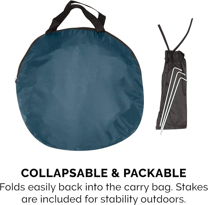 - PERFECT FOR TRAVEL: The playpen's pop-up design ensures that it can be set up, and put away, within seconds; the tent also comes with small metal stakes used to secure it to the ground, making it an ideal outdoor accessory for camping and picnics