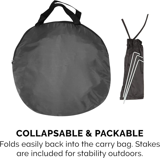 - PERFECT FOR TRAVEL: The playpen's pop-up design ensures that it can be set up, and put away, within seconds; the tent also comes with small metal stakes used to secure it to the ground, making it an ideal outdoor accessory for camping and picnics