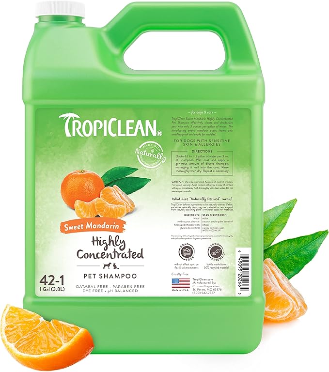 TropiClean High Concentrate Dog Shampoo, Professional Grade & Size for Groomers, 42:1 Dilution, Puppy Safe, USA Made, Sweet Mandarin Scent, 1 Gallon