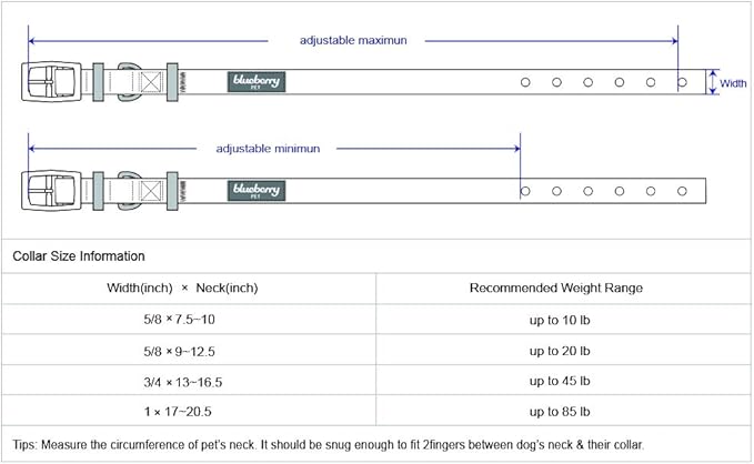 - Neck 17"-20.5", Width 1"; The collar does not stretch itself, please make sure leave ONLY 2 fingers between collar and dog neck. A properly fitting collar and harness won't leave any room for your dog to chew
