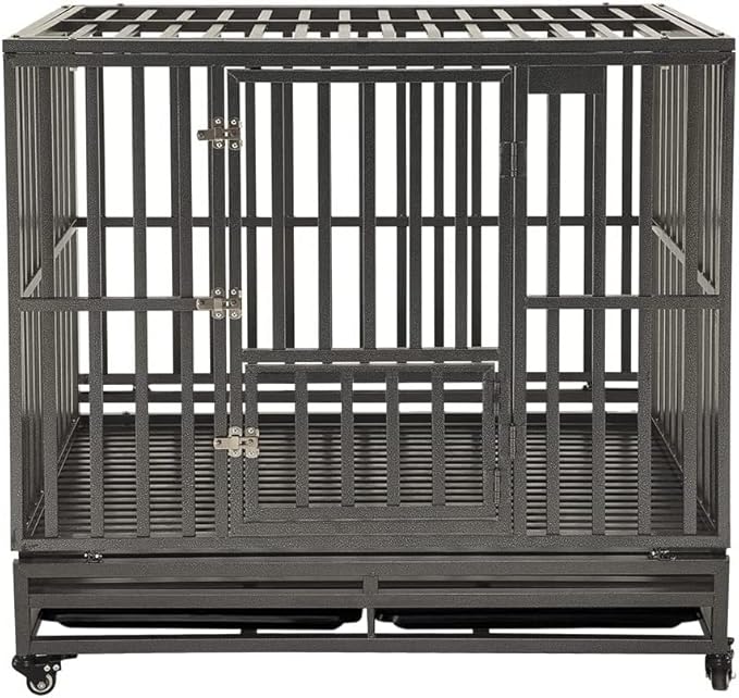 KELIXU 42” Heavy Duty Dog Crate Large Dog Cage Metal Dog Kennels and Crates for Large Dogs Indoor Outdoor with Locks, Lockable Wheels and Removable Tray, Easy to Install, Black