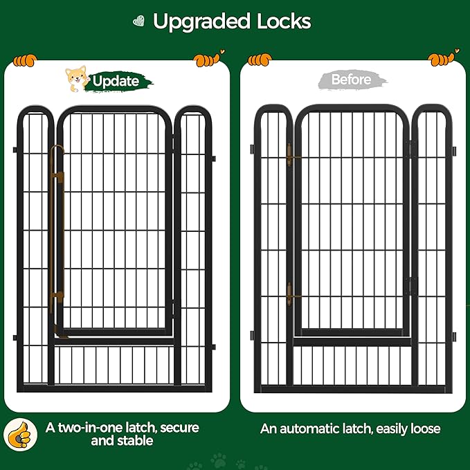 - Safety & Security: Ensuring the safety of your pets is of utmost importance to us. Our exercise pen is crafted with appropriate bar spacing and two latches that lock automatically as you close the door. Rounded edges also protect animals from injuries while preventing damage to wood or PVC floors. Additionally, stakes anchor the panels firmly to the grass or soft ground
