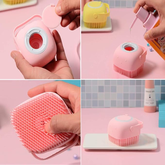 Portable Dog Bath Brush - Pet Massage Brush Shampoo Dispenser, Soft Silicone Brush Rubber Bristle for Dogs and Cats Shower Grooming (Pink)