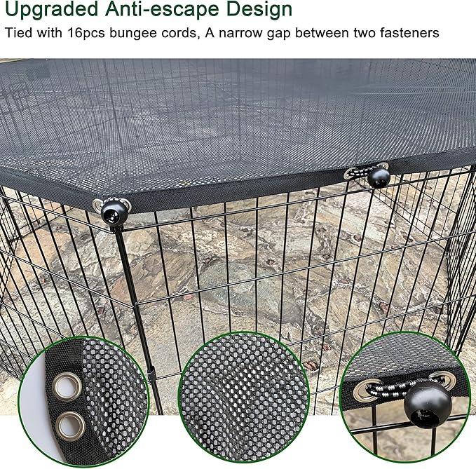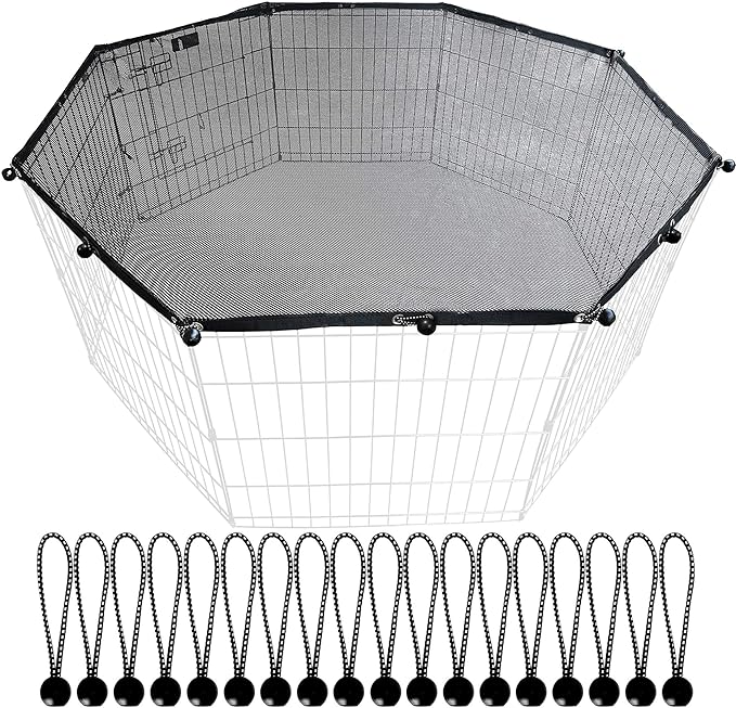 - PREVENT ESCAPE- The protective net is tightly tied with 16pcs bungee cords, so there is just a narrow gap between two fasteners. It effectively prevents the puppy from jumping up and out of the pen