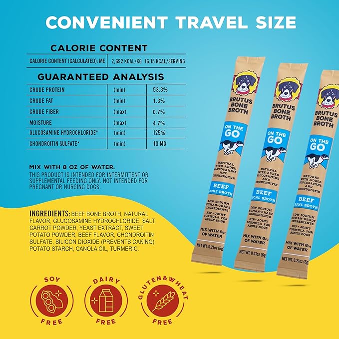 - The same bone broth taste your dog has come to know and love—now in a convenient travel size that’s perfect for when you’re on the go! Brutus Broth’s all natural bone broth powder for dogs provides your dog with the vital nutrients they need while giving them a great tasting beef bone flavor they’ll crave