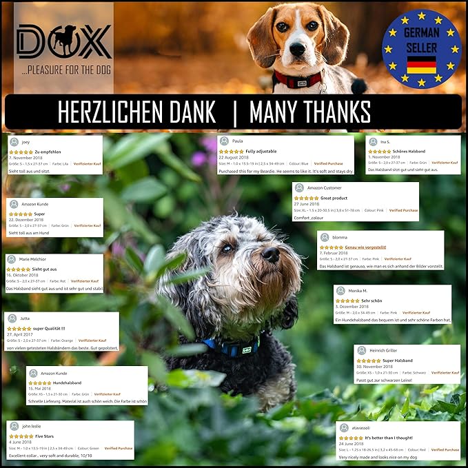 - 【DURABLE MATERIAL】The DDOXX dog collar features light-weight, durable, high-quality nylon material with plastic fittings that provide the most comfortable fit for your dog. The heavy duty stitching ensures long-term usage. Reflective stripes guarantee that your dog is always visible.