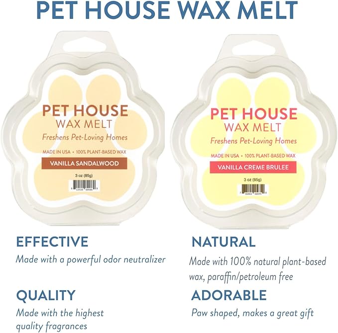 - PET-FRIENDLY FORMULATION - Pet House Wax Melts are pet-friendly and contain no dyes, phthalates, paraffin, or parabens. Specially formulated to remove pet odors, our plant-based/natural soy wax melts are extremely effective and can be used in virtually any wax melter or warmer.