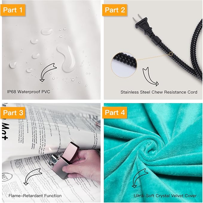 • ❤【Safety and Secure Structure】7-layer protective structure with UL-certified heating wire protect pets from burns. Soft PVC envelope with waterproof and flame-retardant function. Built-in intelligent temperature sensor in the heating pad to prevent overheating to protect pets. Don’t let your pets lay on the pet heating pad without a plush cover.