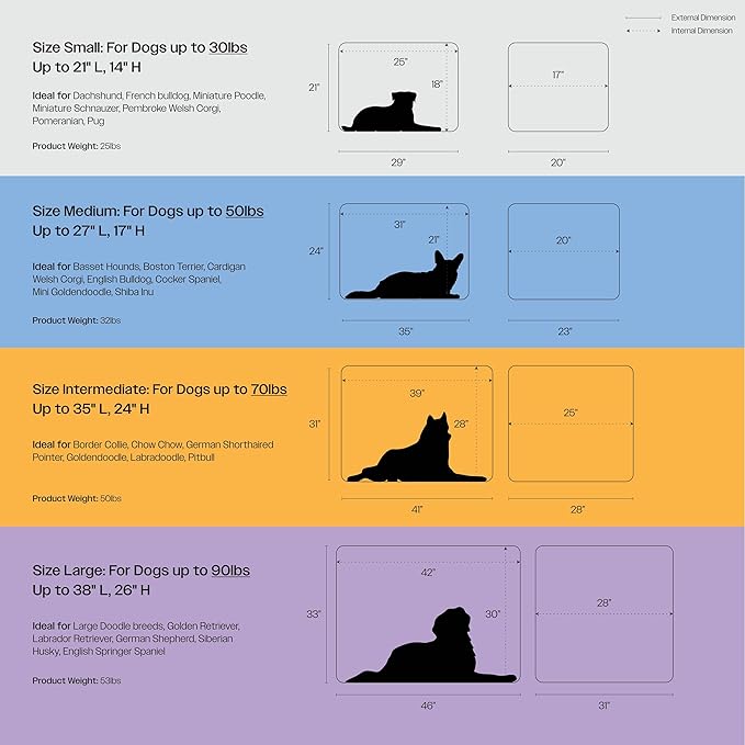 - IS THIS THE RIGHT SIZE FOR MY DOG?: Ideal for dogs up to 17" tall, such as Dachshunds, French Bulldogs, Miniature Poodles, Miniature Schnauzers, Pembroke Welsh Corgis, Pomeranians, and Pugs. Internal dimensions: 25"L x 17"W x 19"H. External dimensions: 28"L x 20"W x 21"H.
