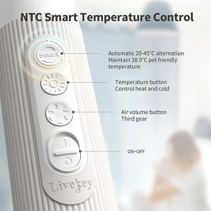 - 【 Smart Temperature Control】 Livekey dog dryer temperature and speed is adjustable, you can choose different dryingfrequency for pets. Besides, the latest NTC Smart Temperature adjustment function can automatically switches between hot and cold air every 3 seconds,maintaining a pet-friendly temperature of 38.9°C.,which is avoids excessive temperature uncomfortable or harmful to pets.