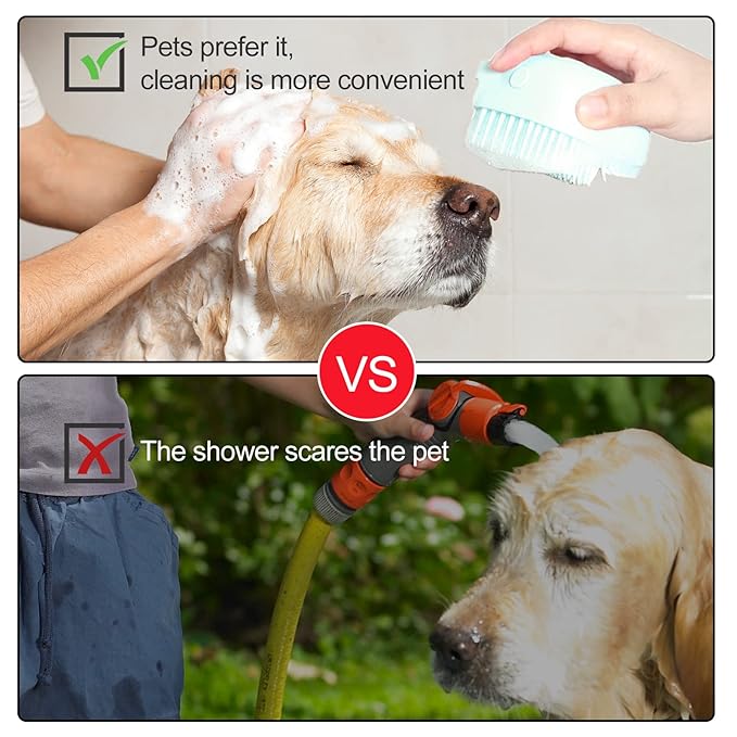- First squeeze slightly and the shampoo can easily come out, then use the dog shower brush scrub away dirt, remove dead skin and loose fur, bring your dog a very comfortable bath and massage soothing effect