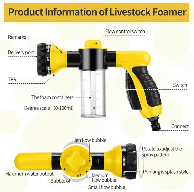 - Adjustable foam concentration: the foam sprayer will mix the soapy water solution with air and tap water to spray foam; You can choose the proper foam concentration to save water and soap, just simply turn the dial to adjust dilution rate of soapy foam, very convenient for you to operate