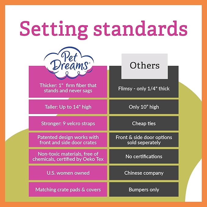 - ๐๐ซ๐๐ฆ๐ข๐ฎ๐ฆ ๐๐ซ๐จ๐ญ๐๐๐ญ๐ข๐จ๐ง & ๐๐จ๐ฆ๐๐จ๐ซ๐ญ: We don't cut corners, our Crate Bumpers are Taller, Thicker and Stronger than Copycats. We use 1โ extra dense fiber to protect and comfort your dog from the hard metal crate bars. Our vertical stitching allows the bumper to fit snugly into the corners of the crate. They are dense enough to stand so they never sag. Our premium fabrics are certified Free of Chemicals because dogs do lick and can ingest harmful substances.