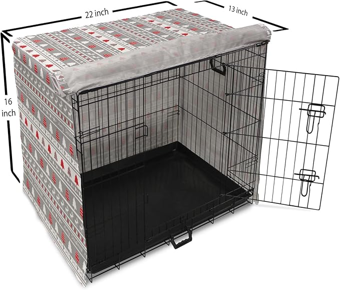 Ambesonne Christmas Dog Crate Cover, Xmas Border Deers Trees and Merry Christmas Lettering Bows Bells Image, Easy to Use Pet Kennel Cover for Small Dogs Puppies Kittens, 22 Inch, Grey White and Red