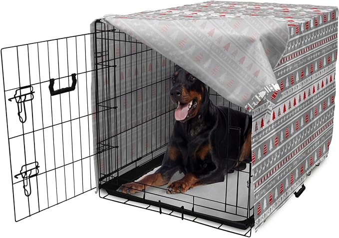 Ambesonne Christmas Dog Crate Cover, Xmas Border Deers Trees and Merry Christmas Lettering Bows Bells Image, Easy to Use Pet Kennel Cover for Medium Large Dogs, 42 Inch, Grey White and Red