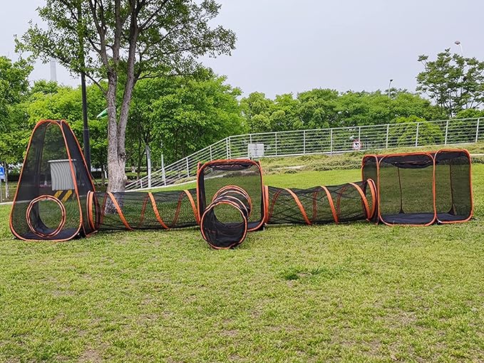 - Note: The bottom material of the cat cage is nylon, it is not recommended to drag it on hard ground, it will cause abrasion.6 in 1 Large Space:Tunnel Cubes:(Size:23.6"x23.6"x23.6"), Hexagon Tent(Size:47*27.5in),Triangle tent(size:31.5"x31.5"x47.2"),3 x Running Tunnel(size:16.1"x35").