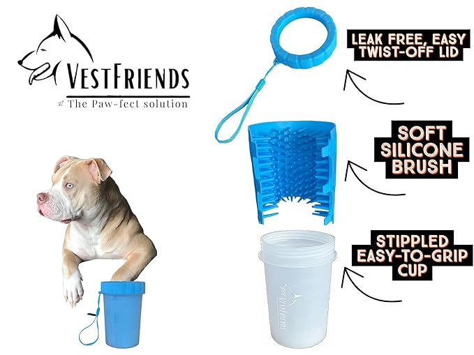 - With the VestFriends Portable Dog Foot Cleaner, achieving clean paws has never been easier. Featuring a large cup design and soft, clustered silicone bristles, our product provides comprehensive paw coverage and a gentle cleaning experience. This ensures that every time you use the VestFriends Paw Cleaner, you can count on achieving perfectly clean paws with minimal hassle.
