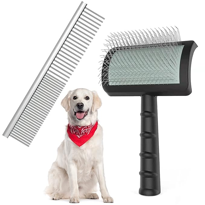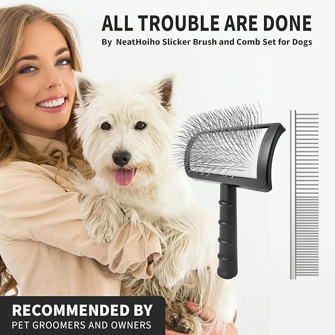 - PERFECT HAIR REMOVAL AND GROOMING SET: The NeatHoiho grooming set includes a slicker brush and a heavy-duty metal comb , so you can groom your dog or cat with comfort at home.The slicker brush and comb set is perfect for keeping short or long hair clean and tangle-free, as well as for removing dirt and dander from pets with sensitive skin