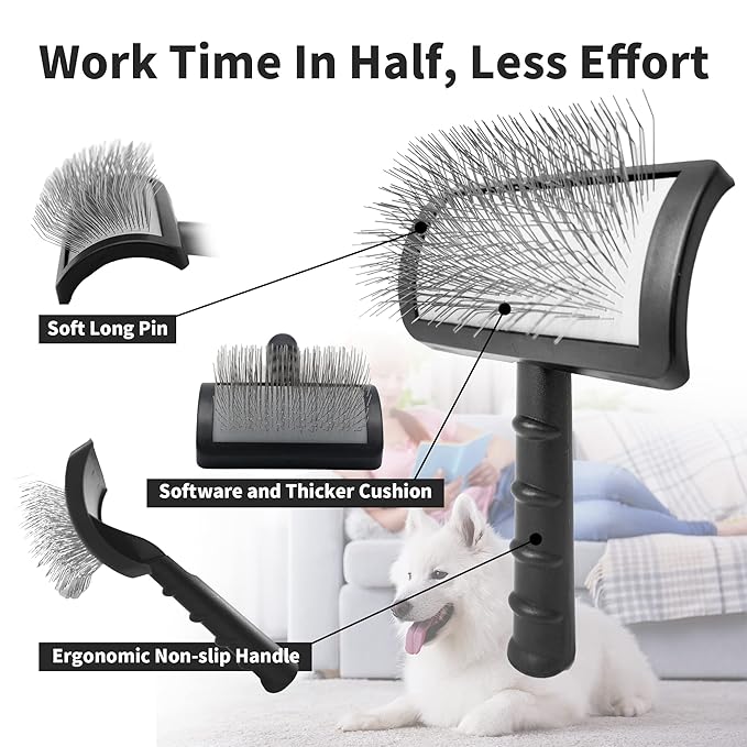- LONG PINS and CUSHION PAD:NeatHoiho slicker brush has 50% longer, denser, and softer pins– each pin is approximately 1 inch long.Each pin is bent and angled at approximately 45 degrees, so it won’t scratch your dog’s skin. This dog slicker brush has a retractable cushion pad that protects your pet's skin from being scratched by the brush's pins