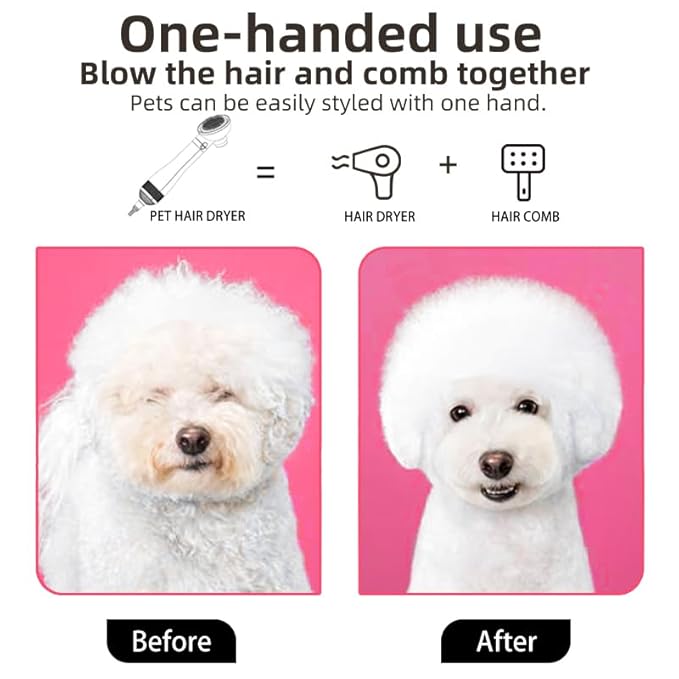 - 2-in-1 Deisgn: Pet hair dryer helps you dry and brush pet's hair at the same time, Easily remover matted hair and tangles from your pet’s coat while drying