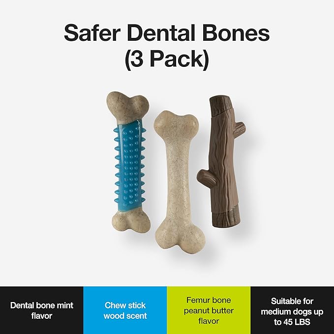 - FOR MEDIUM DOGS: Our bundle is meant to promote healthy teeth & gums by using flavors that we know your best friend will enjoy. With mint used for the dental bone, a wood-scented femur, & a chicken dental treat, your dog will have that tail wagging!