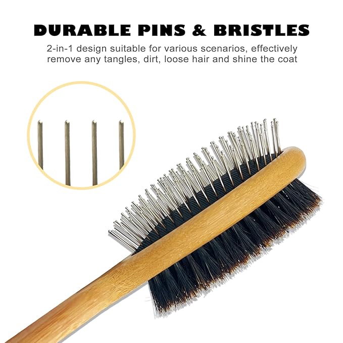- 🐾TWO IN ONE - This double-sided brush features two brushes and grooming actions in one! Made of lightweight, hard-wearing beech wood. One side includes stainless steel tips with a protective coating to take away lose hair and detangle coat; the other side contains solid nylon bristles to redistribute natural oils for a healthy, shiny coat.