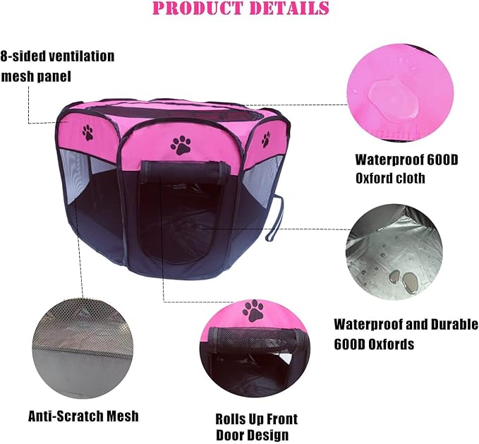 - 3.Premium Construction: Constructed from thick waterproof 600 D polyester oxford fabric,breathable mesh window shades, and reinforced with iron wiring. Spacious 8-panel design with reinforced seams and corners. Zippered door provides easy in/out access for your pet. Keep your pet safely inside everywhere.