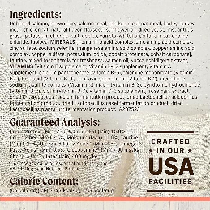 - Made with high-quality proteins to help maintain lean muscle. This salmon dog food formula includes omega-6 and omega-3 fatty acids to promote healthy skin and coat