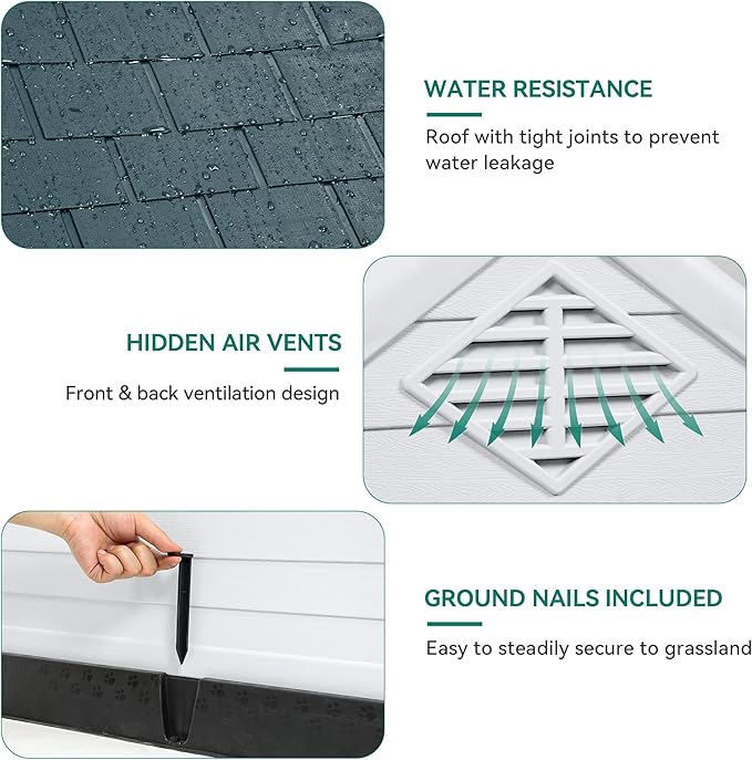 - WEATHERPROOF STRUCTURE- Sealed protective design, 2.8 in high base along with slanted roof harmonize to resist dirt, rain, snow, and other weather elements; Our outdoor dog house also has 2 ground nails to ensure stability during heavy winds.