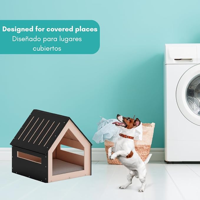 Big House for Pets, Wooden House for Pets for Interiors, Resistant Wood with Cushion for Dog Included, Minimalist, Elegant and Resistant, 24x25x24.5 in, Black