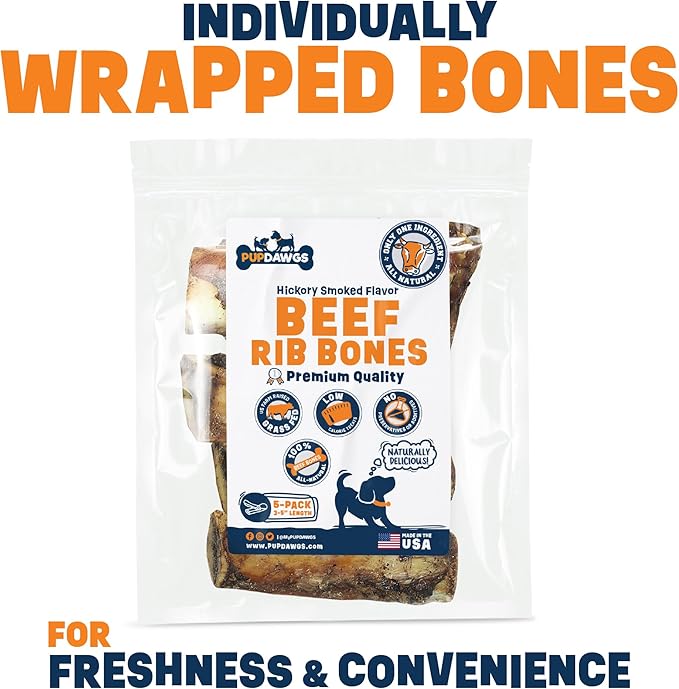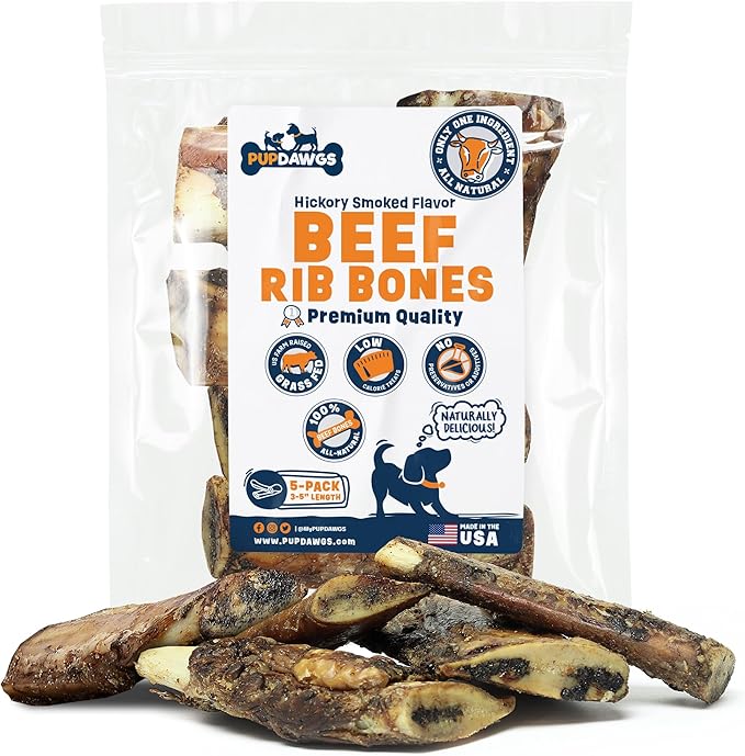 Single Ingredient Dog Bones - Made in USA - Small Beef Rib Bones - Natural Dog Bones for Aggressive Chewers - from USDA Inspected Beef - Hickory Smoked - Wrapped in Sets of 5 (5 Piece Pack)
