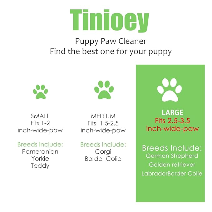 - 【Suitable for large breed dogs】Tinioey dog feet cleaner measures 8.7 in tall and 4.7 in wide. The muddy paw cleaner is Suitable for 2.5-3.5 inch-Wide-Paw Large dogs. If your baby is an oversized German Shepherd or oversized Golden Retriever, please measure your baby's paw size before placing an order, if the size is not suitable or your dog doesn't like our dog paw cleaner for large dogs, please contact us for a replacement or return. Thanks for understanding.