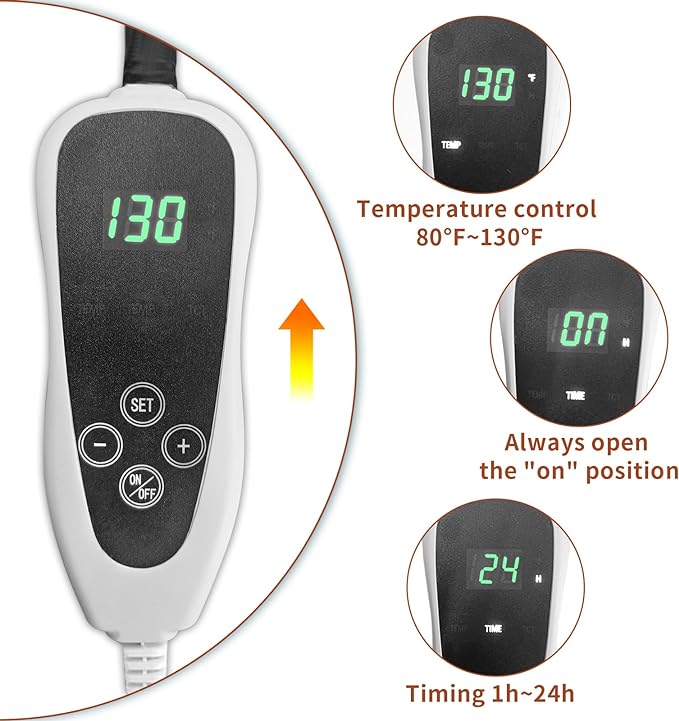 - Intelligent Thermostat: Adjustable temperature 80°F~130°F, the opening time between 1 hour~24 hours is freely adjustable, new normally open function "on" gear. Please note that turn off the pet heating pad promptly after use