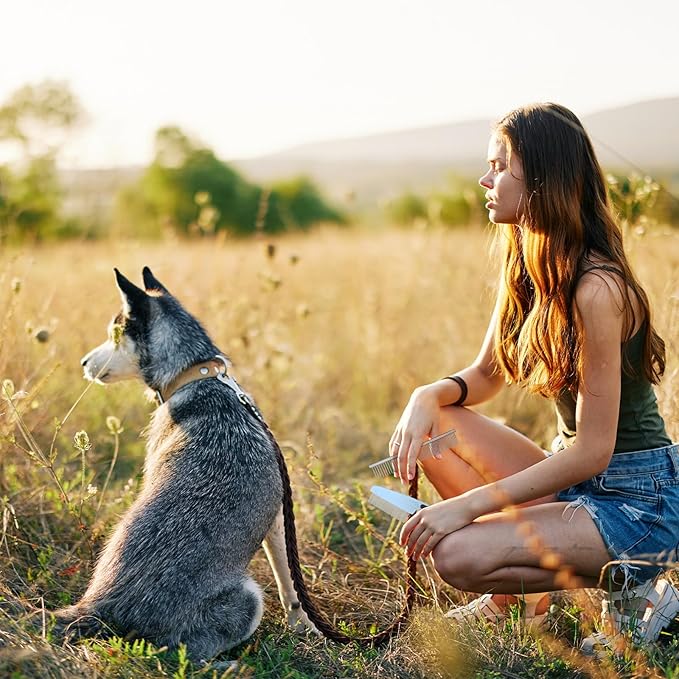 - grooming: safe & efficient dog brush for dematting and deshedding; Our dog brush with fine rounded teeth for security; The silver brush comes in two tooth densities to handle stubborn mats and tangles for pets of different sizes and hair types, while The comb with handle has dense teeth and can be applied to remove floating hair, dust, impurities, fleas and so on from pet hair; The grooming can keep your home stay clean and tidy, especially in the pet hair losing season
