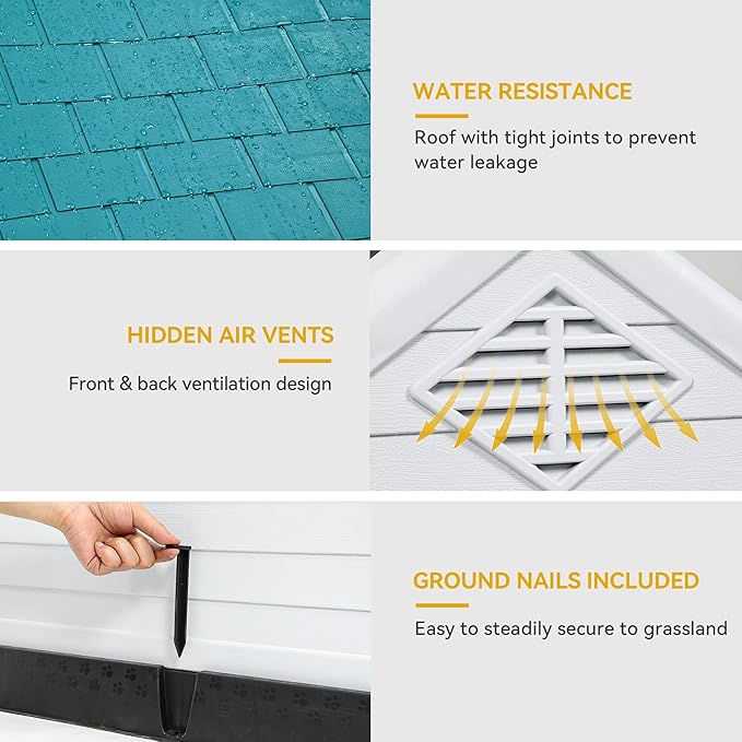 - Elevated Base: Elevated base raises the plastic dog house off the ground to reduce moisture; Two ground stakes increase stability and prevent shaking caused by wind, rain, or your dog’s movements