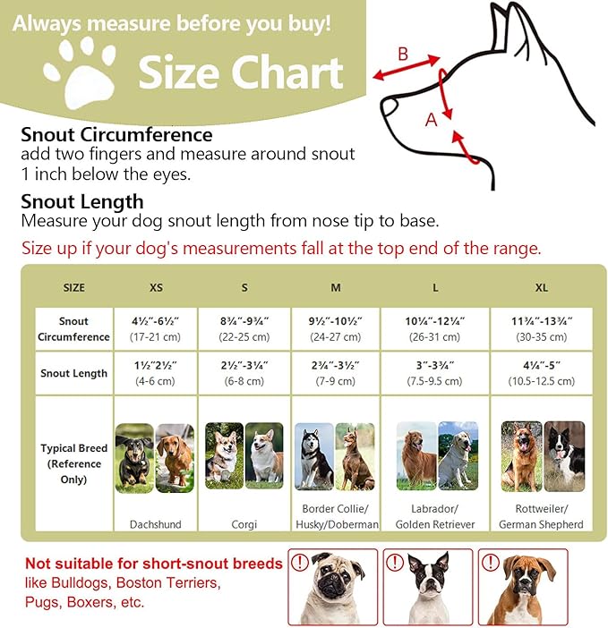 - MEAURE BEFORE BUYING: Add two fingers, then measure around top of snout about ½" below eyes. The extra space is vital for your pet's safety and comfort. The size chart is for reference only. For your pet's comfy, please measure before buying. 5 sizes available for Border Collie, Husky, Golden Retriever, German Shepherd and so on. [NOT suitable for SHORT snout dogs such as Pitbull and Boxer.