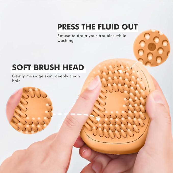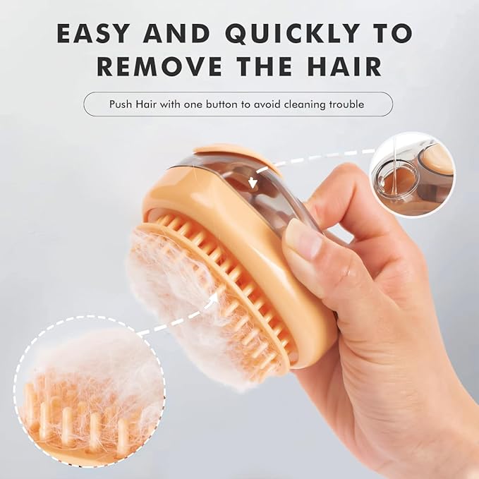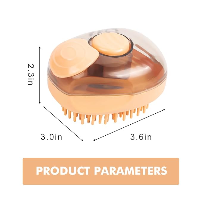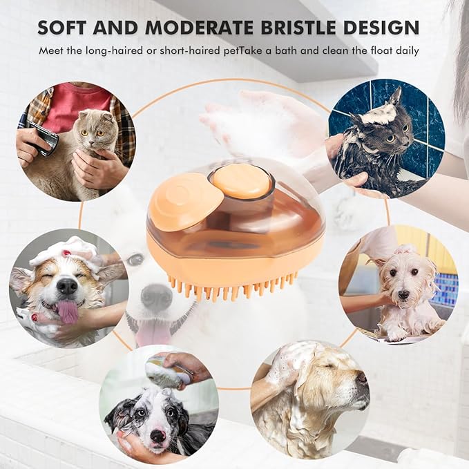 - 【New Design】The side of this dog bath brush scrubber has an anti-slip design which can offering a comfortable grasp when bathing your pet. At the top of the bottom, you can open the small cover and pour shampoo and water. When in use, you can press the top silicone button to dispense blisters to your pet‘s fur coat. then gently remove loose hair, dust and dirt. After finishing bathing, just gently press the one-click cleaning button to easily clean the hair on the brush.