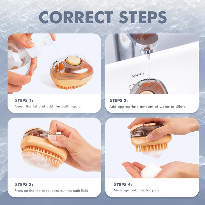 - 【Bubble Maker】Our dog scrubber for bath with one-piece foam reservoir design can help you save a lot of time squeezing and diluting shower gel. it can be refilled with shampoo, dilute the pet shampoo beforehand, then press the top to dispense blisters to your pet‘s fur coat while taking a shower, which can achieve the effect of saving shampoo and create rich foam.