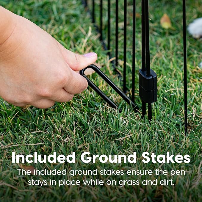 - STURDY: Four strong ground anchors keep the playpen securely in place, even outdoors. Whether in the yard or the garden, this dog fence ensures your pet's safety while providing freedom to roam.