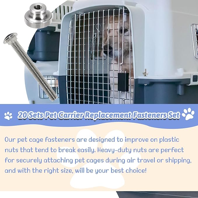 - Convenient Set: Our pet carrier replacement fasteners set Includes 20 heavy-duty solid stainless steel nuts and 20 M6 bolts, providing all the fasteners you need for your pet carrier or kennel