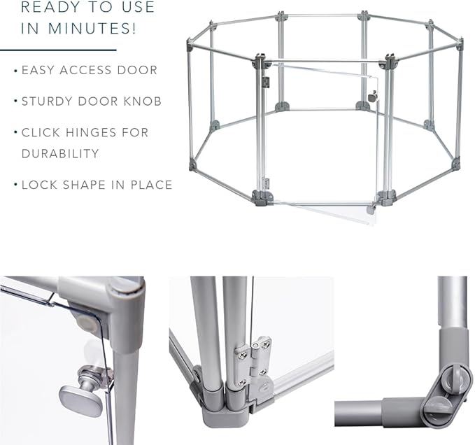 - SAFE, SPACIOUS & EXPANDABLE – This clear playpen for dogs offers a secure, enclosed space for pets to exercise, relax, and play. Its expandable design allows it to become a big playpen for a larger setup, accommodating dogs of various sizes. The transparent panels help pets feel included while keeping them safely contained.