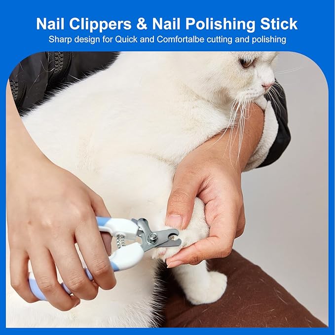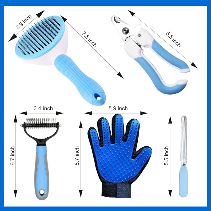 - ๐พ [5-in-1 Pet Kit & Portable] 5-in-1 Pet Kit neatly organized in a reusable zipper bag for on-the-go ease. Included: 1 self-clean slicker brush, 1 pet grooming rake, 1 pet nail clipper, 1 nail polish stick, and 1 upgraded grooming glove. Made of high-quality, wear-resistant rubber and stainless steel, these tools are not only durable but also easy to clean. Whether you're at home, in the park, or on the road, your pet's care is always at your fingertips.