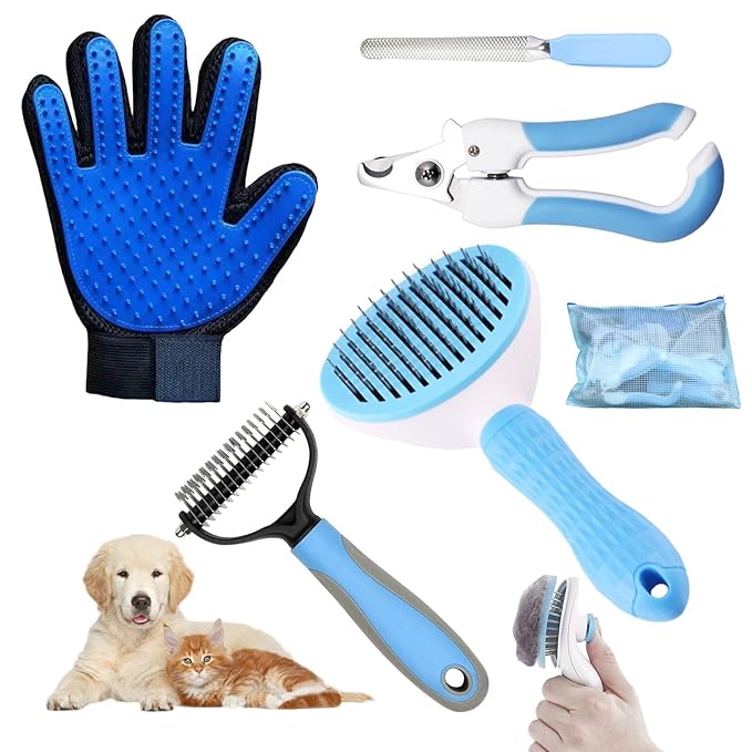 - ๐พ [Various Dematting & Nail-Care Tools] The dog brush kit boasts an array of dematting and nail care to cater to all pet's needs. ๐ญ. The upgraded grooming glove offers a comfortable massage during the shower. ๐ฎ. The self-cleaning slicker brush can gently remove loose hair. ๐ฏ.The double-edged de-matting rake minimizes shedding. ๐ฐ. The sharpened pet nail clipper ensures quick and safe nail trimming. ๐ฑ. The nail polish stick can round off your pet's nails, preventing accidental scratches.