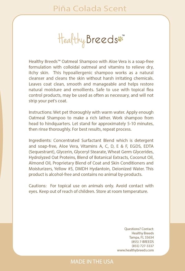 - pH balanced! Healthy Breeds offers a high-quality oatmeal shampoo that is gentle and soap-free! Help restore natural moisture and emollients in your dog’s skin and coat!