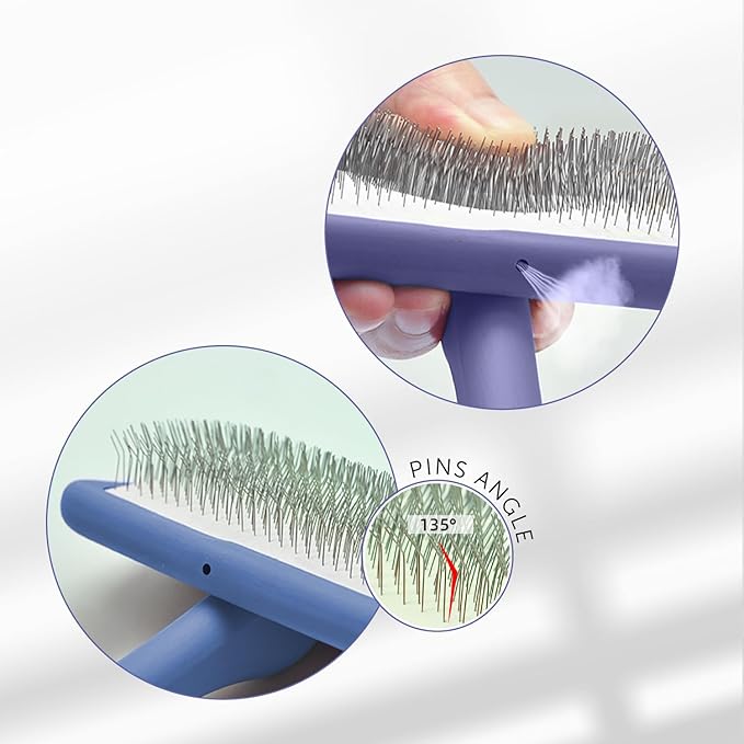 - 135° STAINLESS STEEL BRISTLES - With a curvature angle of 135°, the bristles effortlessly comb through the fur, removing loose hair and tangles. They offer a gentle massage that enhances blood circulation and stimulates hair growth.