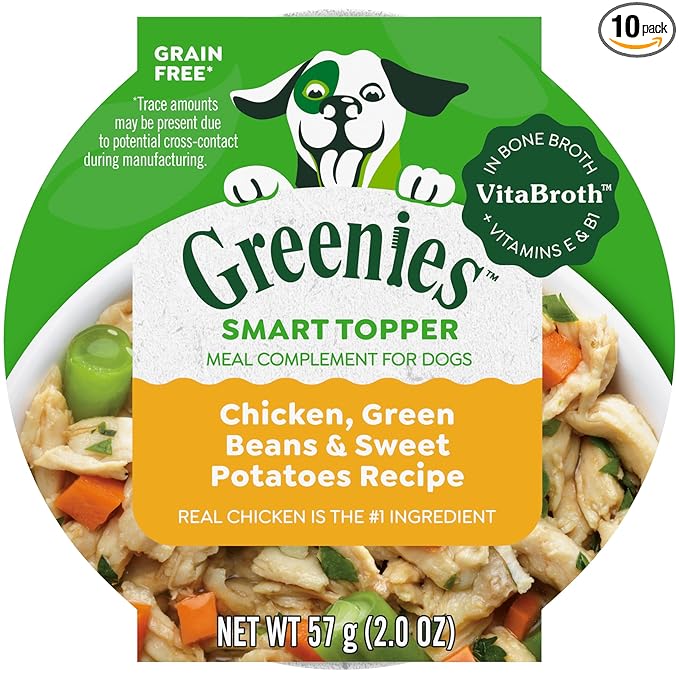 - Contains ten (10) 2.0 oz trays of Greenies Smart Topper High Protein Wet Mix-In for Dogs, Chicken, Green Beans & Sweet Potatoes Recipe In Vitabroth Broth - Bone Broth + Vitamins E & B1.
