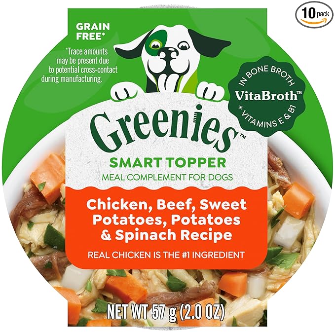 Greenies Smart Topper High Protein Wet Mix-in for Dogs, Chicken, Beef, Sweet Potatoes, Potatoes & Spinach Recipe in Vitabroth™ Broth- Bone Broth + Vitamins E & B1, Pack of 10